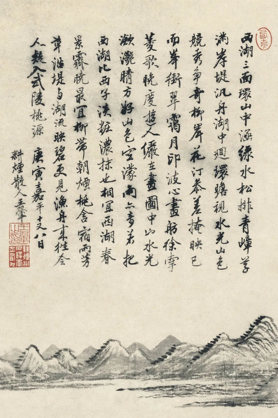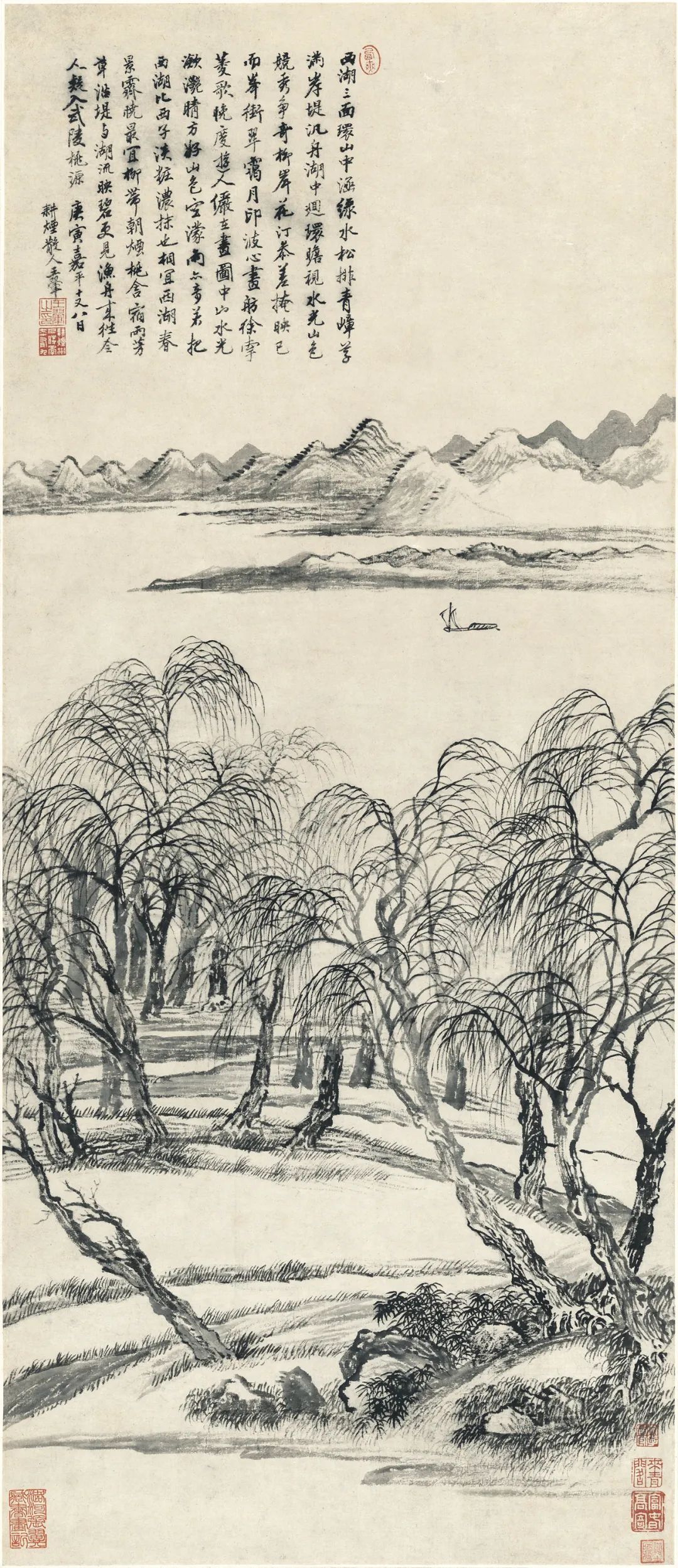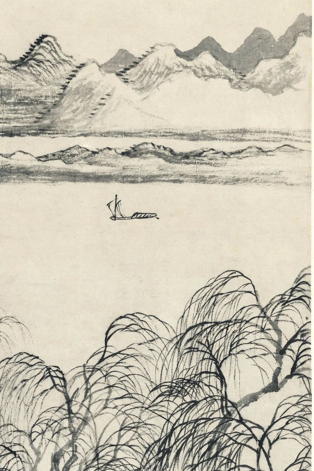 近景以油腻墨色画稀疏柳林。枝干狼籍,富于变化,边远群山,波状更始,湖上轻舟,张帆而行。翰墨简练,干脆利落。